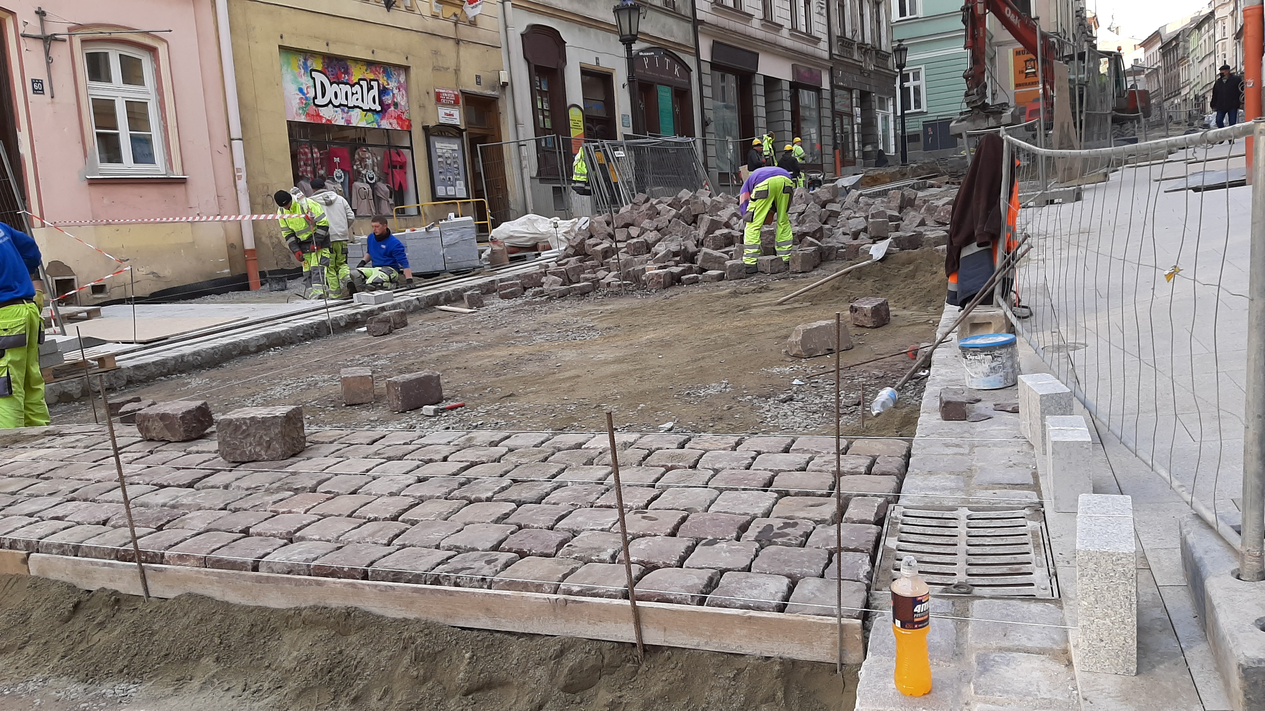 stronie. W dniu wczorajszym rozpoczęto układanie drogi z kostki porfirowej pochodzącej z remontu ul. Frysztackiej.
