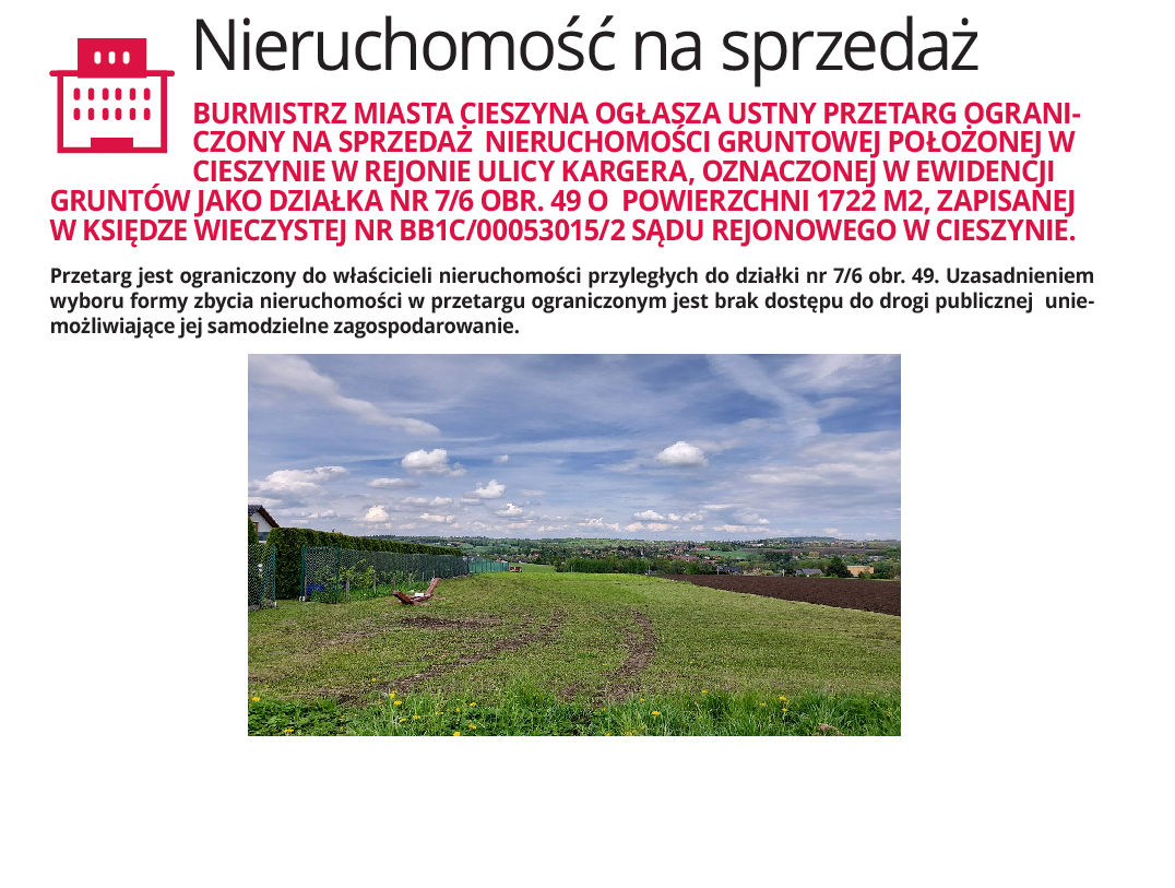 2023-07-14Burmistrz Miasta Cieszyna ogłasza ustny przetarg ograniczony na sprzedaż nieruchomości gruntowej położonej w Cieszynie w rejonie ulicy Kargera, oznaczonej w ewidencji gruntów jako działka nr 7/6 obr. 49 o powierzchni 1722 m2, zapisanej w księdze wieczystej nr BB1C/00053015/2 Sądu Rejonowego w Cieszynie.