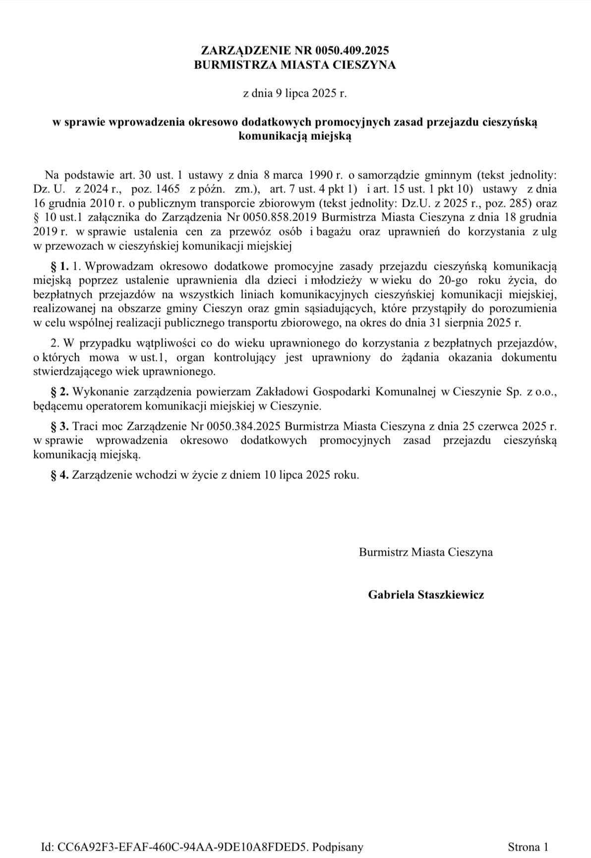 ZARZĄDZENIE NR 0050.409.2025 BURMISTRZA MIASTA CIESZYNA z dnia 9 lipca 2025 r.