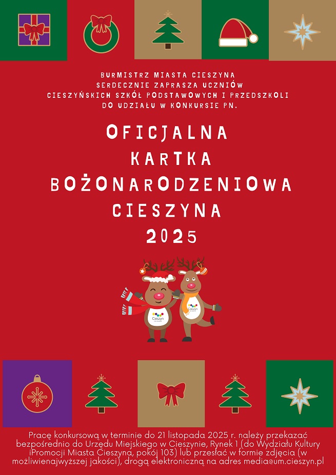 2025-10-20Burmistrz Miasta Cieszyna serdecznie zaprasza uczniów cieszyńskich szkół podstawowych i przedszkoli do udziału w konkursie pn. „Oficjalna kartka bożonarodzeniowa Cieszyna 2025”. Zadaniem uczestników konkursu jest przedstawienie własnej wizji, nastroju oraz tradycji Świąt Bożego Narodzenia w postaci kartki świątecznej. Praca, której zostanie przyznana nagroda główna zostanie wydrukowana w formie kartki świątecznej i otrzyma status Oficjalnej kartki bożonarodzeniowej Miasta Cieszyna w roku 2025.