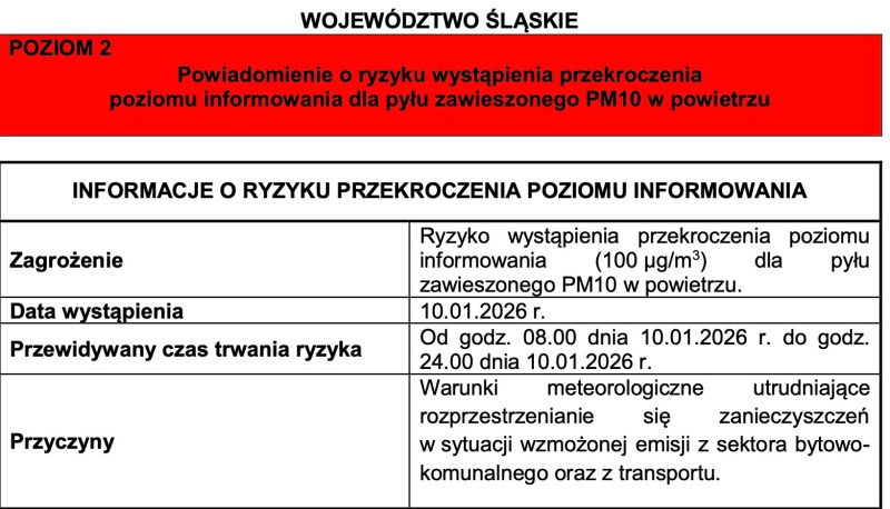 Prognozowane na dzień 10.01.2026 r. przekroczenia poziomu informowania dla pyłu PM10 obejmują: powiat miasto Bielsko-Biała, powiat cieszyński, powiat miasto Rybnik, powiat miasto Żory, powiat miasto Jastrzębie-Zdrój, powiat rybnicki, powiat mikołowski, powiat wodzisławski.
