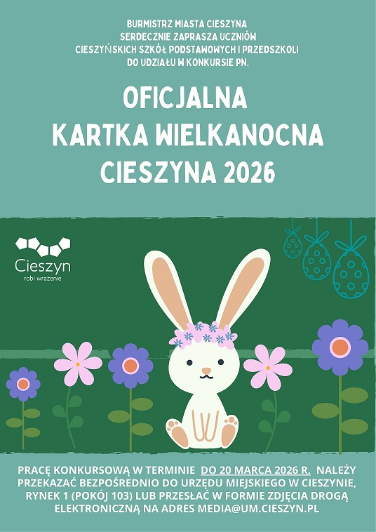 Burmistrz Miasta Cieszyna serdecznie zaprasza uczniów cieszyńskich szkół podstawowych i przedszkoli do udziału w konkursie pn. „Oficjalna kartka Wielkanocna Cieszyna”. Zadaniem uczestników konkursu jest przedstawienie własnej wizji, nastroju oraz tradycji Świąt Wielkanocnych i ich związku z Cieszynem w postaci kartki świątecznej. Praca, której zostanie przyznana nagroda główna zostanie wydrukowana w formie kartki świątecznej i otrzyma status Oficjalnej kartki Wielkanocnej Miasta Cieszyn w roku 2026. Ponadto zostanie przyznanych dziesięć wyróżnień, a wszyscy laureaci konkursu otrzymają nagrody rzeczowe.
