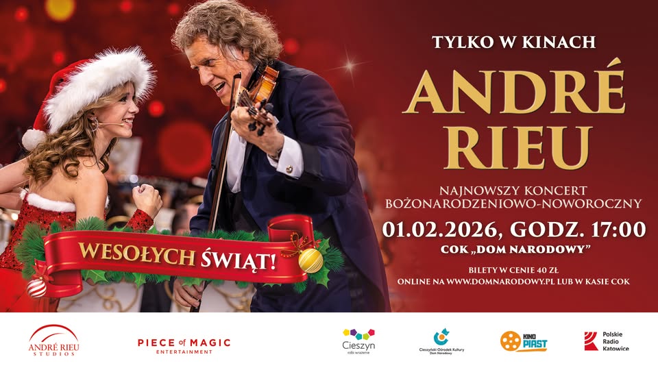 Cieszyński Ośrodek Kultury "Dom Narodowy" oraz Kino Piast zapraszają na olśniewające show Maestra André Rieu. Zapraszamy do Cieszyńskiego Ośrodka Kultury "Dom Narodowy" na retransmisję najnowszego koncertu bożonarodzeniowo-noworocznego z Maastricht pod tytułem „Wesołych Świąt!”. Projekcja koncertu odbędzie się w niedzielę 18 stycznia oraz ponownie, w niedzielę 1 lutego o godzinie 17:00. Bilety dostępne w kasie Cieszyńskiego Ośrodka Kultury w godzinach jej funkcjonowania oraz online.